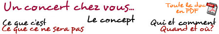 Ce que ce ne sera pas : Ce ne sera pas une prestation de type animation ou piano-bar ni de la musique d'ambiance. Ce que c'est : C'est un moment unique et exceptionnel puisqu'il ne sera mis en place que pour vous. Il s'agit d'un concert avec tous les ingrédients nécessaires : un artiste et un public mais cela se passe chez vous. Je viendrai y chanter, partager mes chansons et celles que j'aime pour un moment de proximité, de convivialité et d'échange ou chacun se retrouve entre amis autour d'un verre et/ou d'une collation, repas… Le concert : Sa durée est d'1h15 à 1h30 et sera bâti aux ¾ de mes propres compositions et pour ¼ de reprises de la chanson française : Brassens, Brel, Nougaro, Barbara, Higelin… En solo, il peut être totalement acoustique mais plus généralement il est très légèrement sonorisé. Je chante accompagné de ma guitare et si vous avez un piano ce sera tout à fait possible d'en user et si ce n'est pas le cas, je peux le fournir… D'autres questions? (voir Qui et comment...) ou (généralités...) Voilà, n'ayez plus peur… le plus gros risque, c'est de passer un très bon moment …Vous avez décidé… ?! J'arrive !